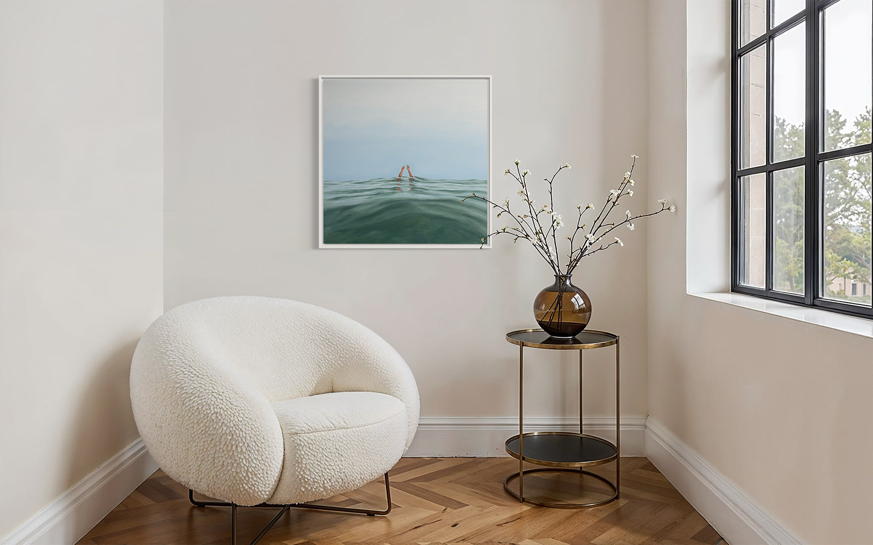 Bring home the spirit of summer with Double Dipped, II — a fine art print of Candace Ceslow’s sold original oil painting. This piece captures the quiet balance between movement and stillness, featuring a single figure floating in soft green sea tones beneath an endless sky. It’s playful, calm, and deeply serene — a reflection of freedom and ease found in the ocean’s embrace.