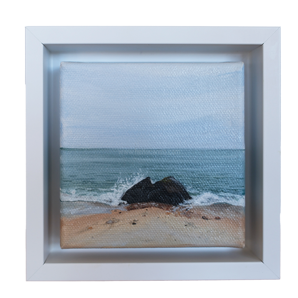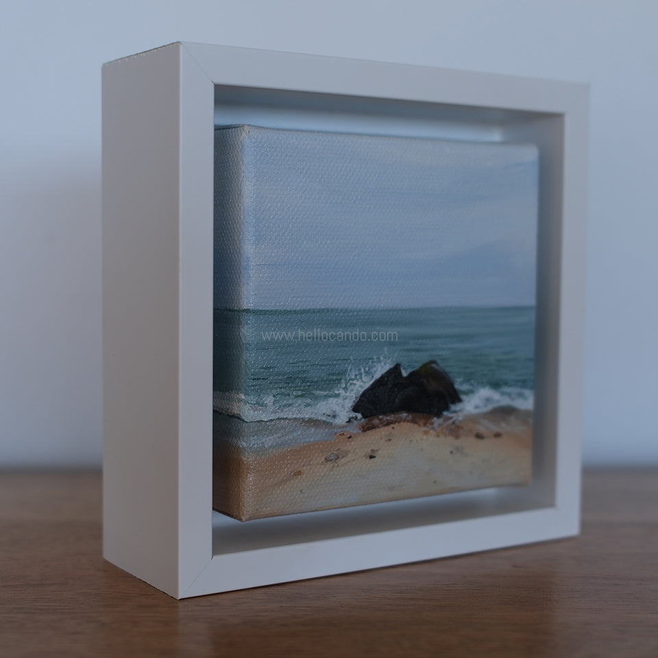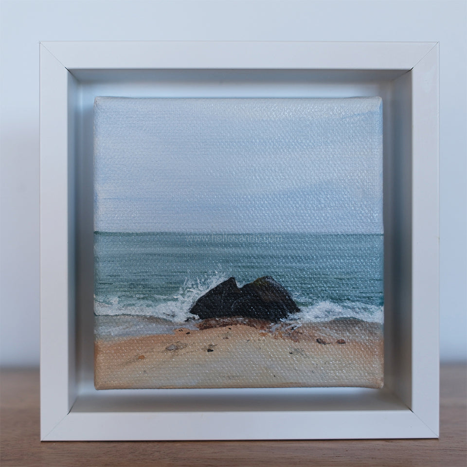 Bring a tiny dose of shoreline calm into your home with Mini #32 — an original 4x4-inch oil painting from my 2025 Mini Collection. Soft waves wrap around a dark rock, capturing one of those simple, grounding moments by the water.