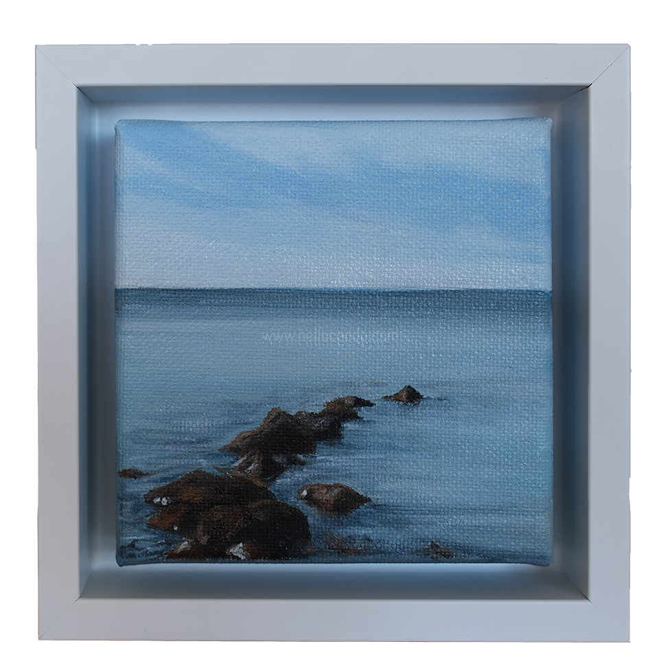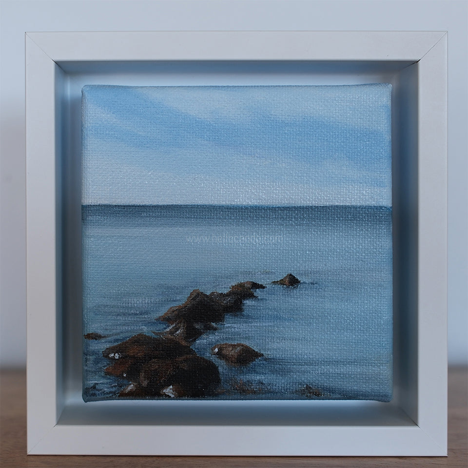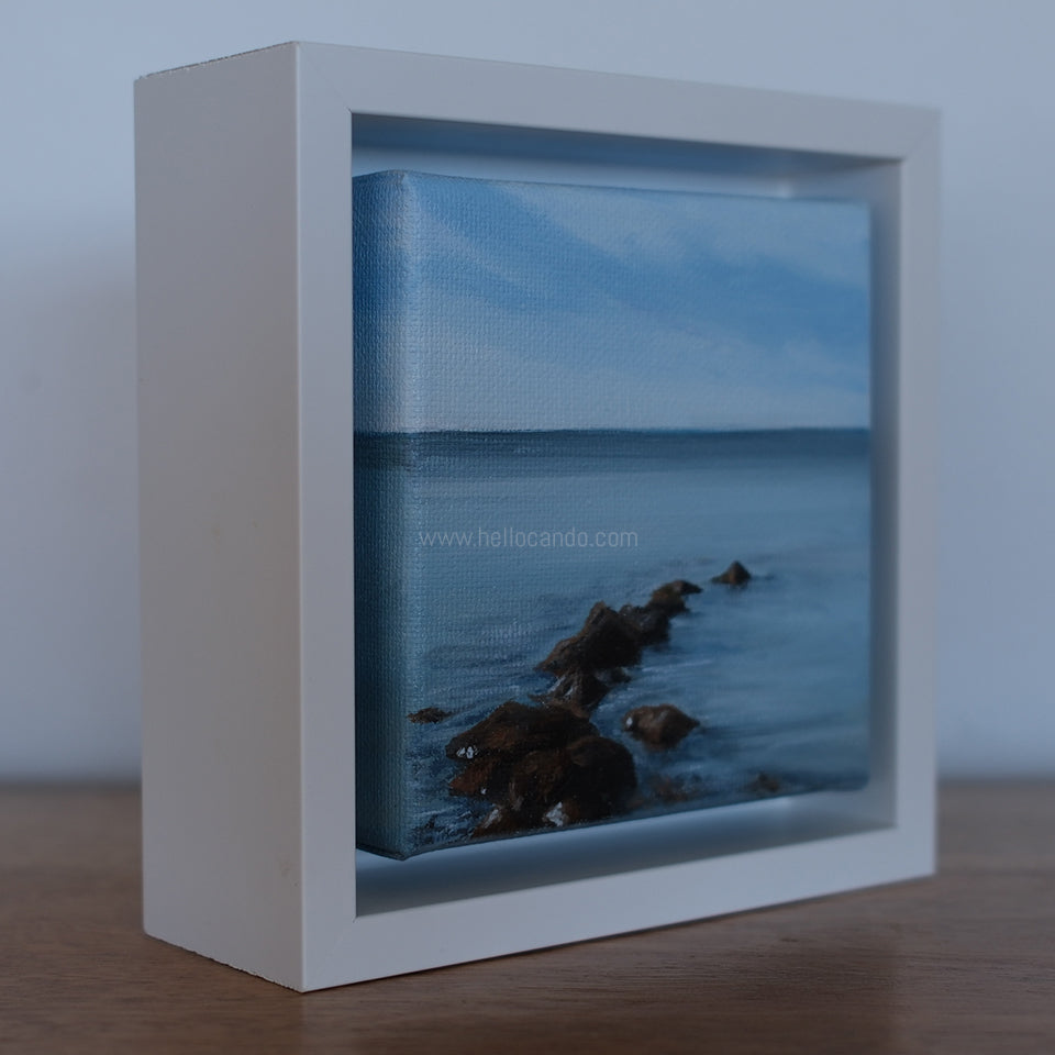 Mini #34 features a quiet East End jetty stretching into calm water — simple, grounding, and full of coastal texture. This original 4x4-inch painting adds a soft, moody ocean moment wherever it’s placed.