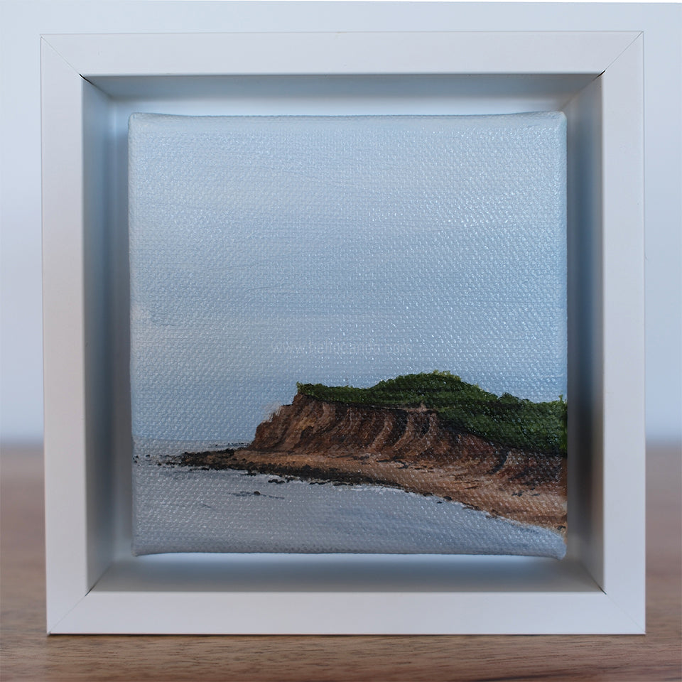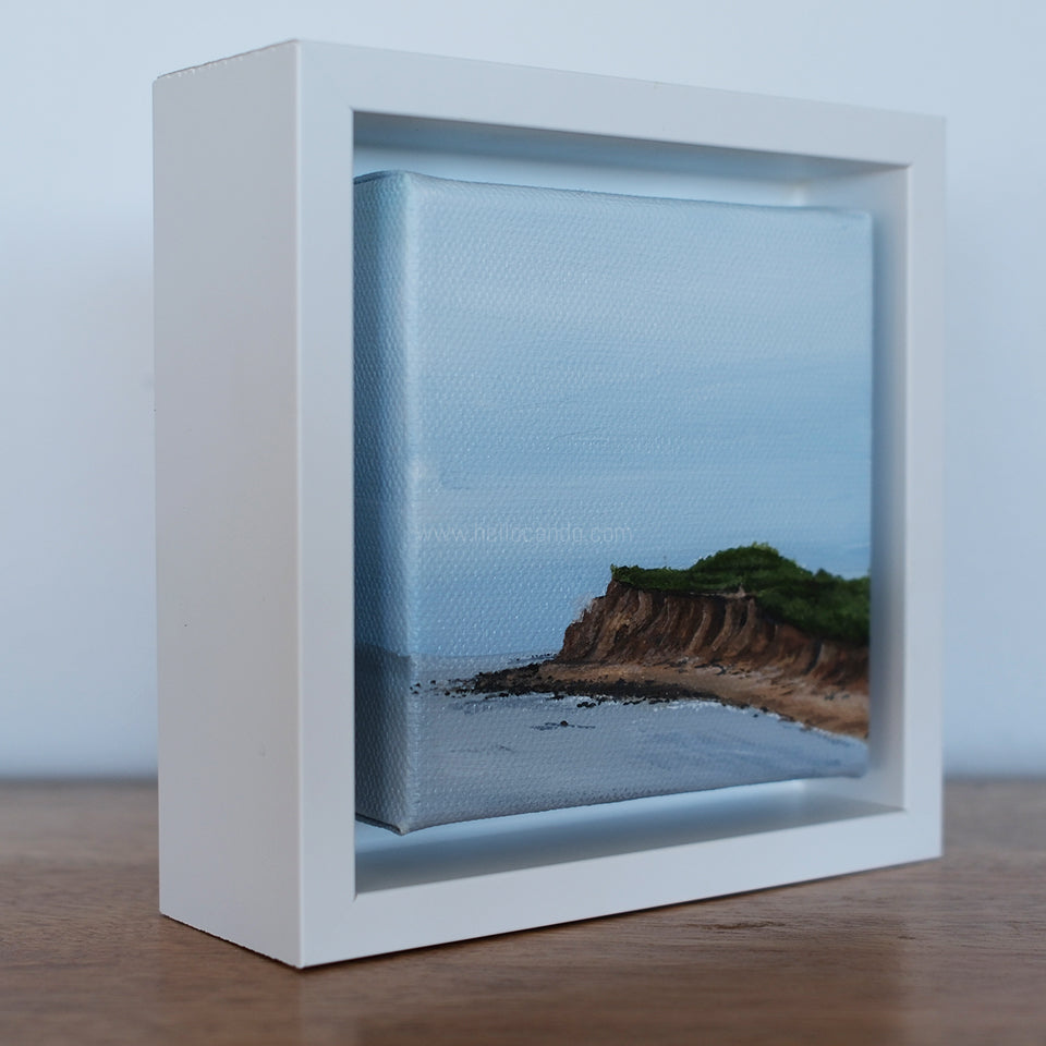 This 4x4-inch original oil painting is framed in a clean white shadowbox, making it easy to display on a shelf or tuck into a gallery wall. A perfect gift for anyone who loves coastal landscapes and simple, calming artwork.