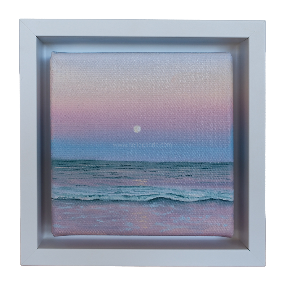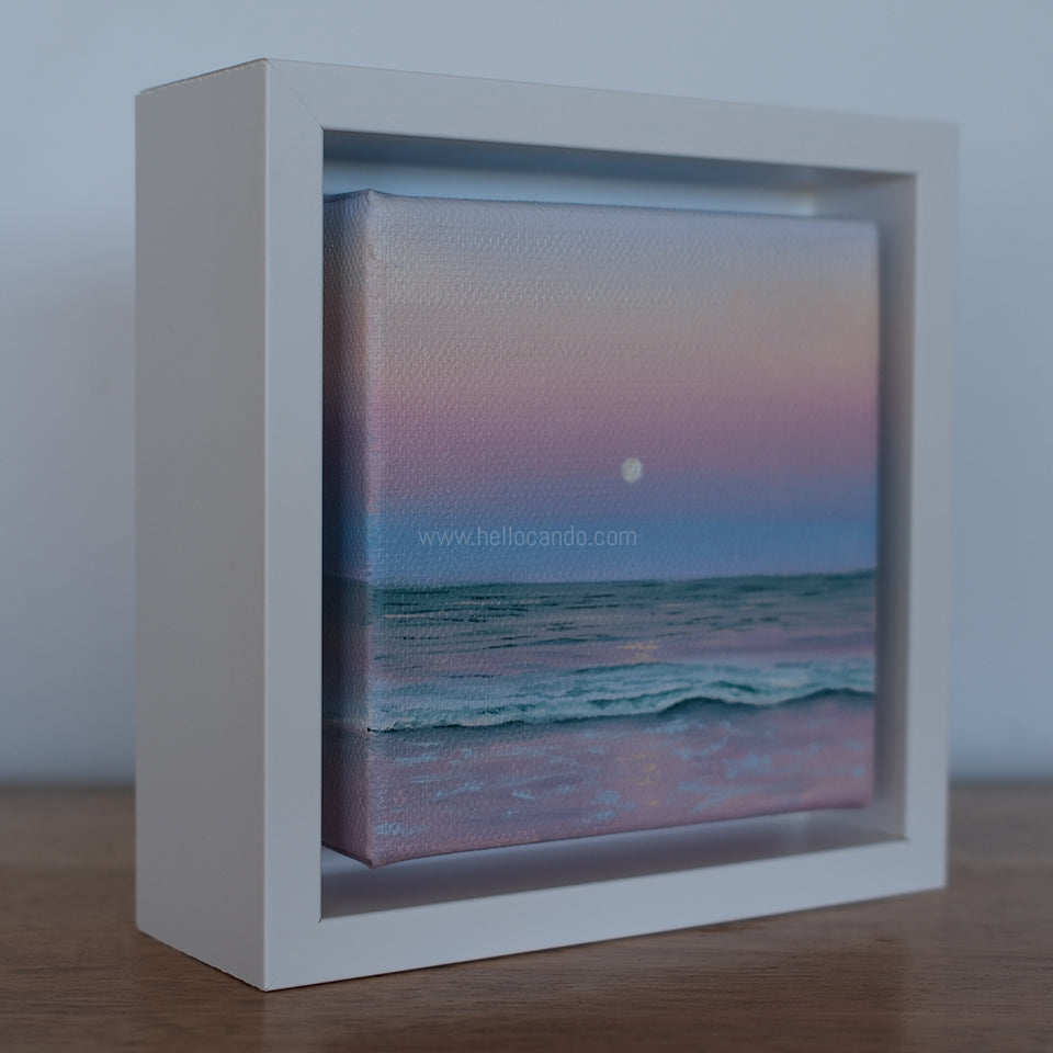This 4x4-inch original oil painting is framed and ready to display. A lovely piece for moon lovers, ocean lovers, or anyone who gravitates toward soft, calming artwork.