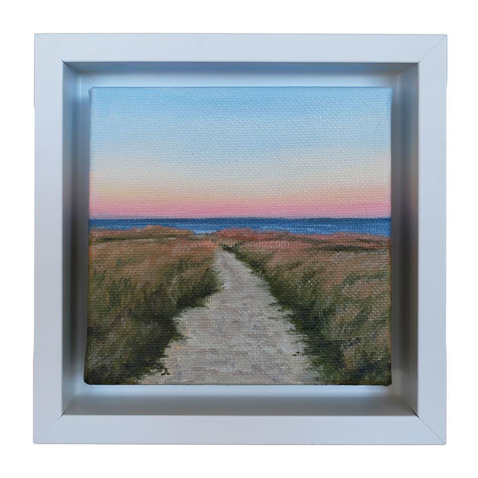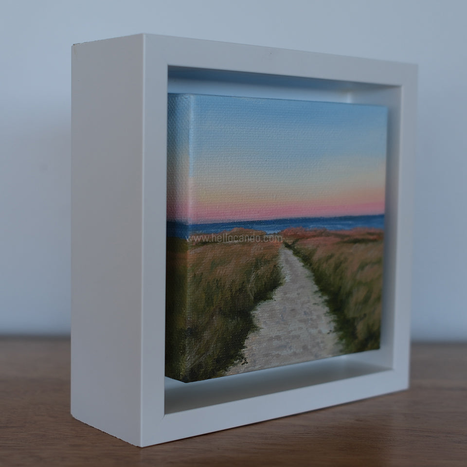 Mini #39 brings you straight onto a sandy path leading to the water as the sky shifts into soft evening color. Warm, calm, and familiar—one of those classic East End views you instantly recognize.