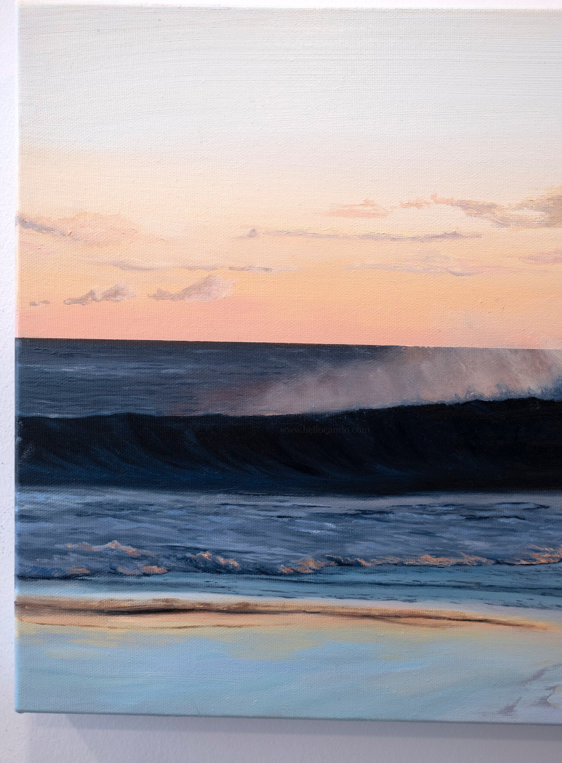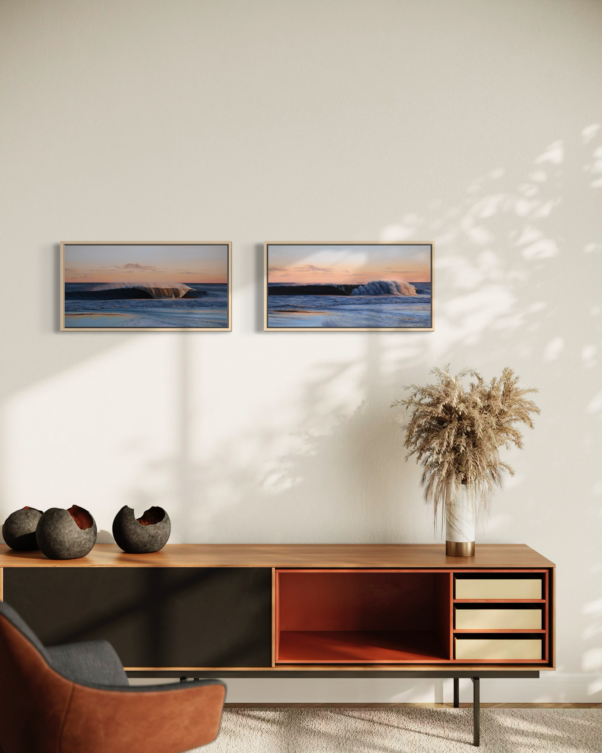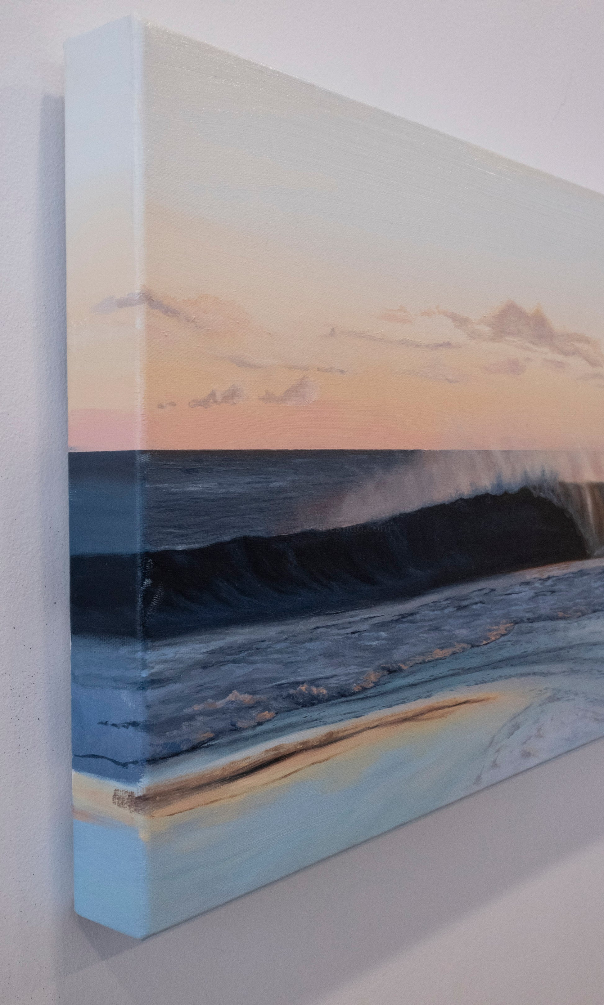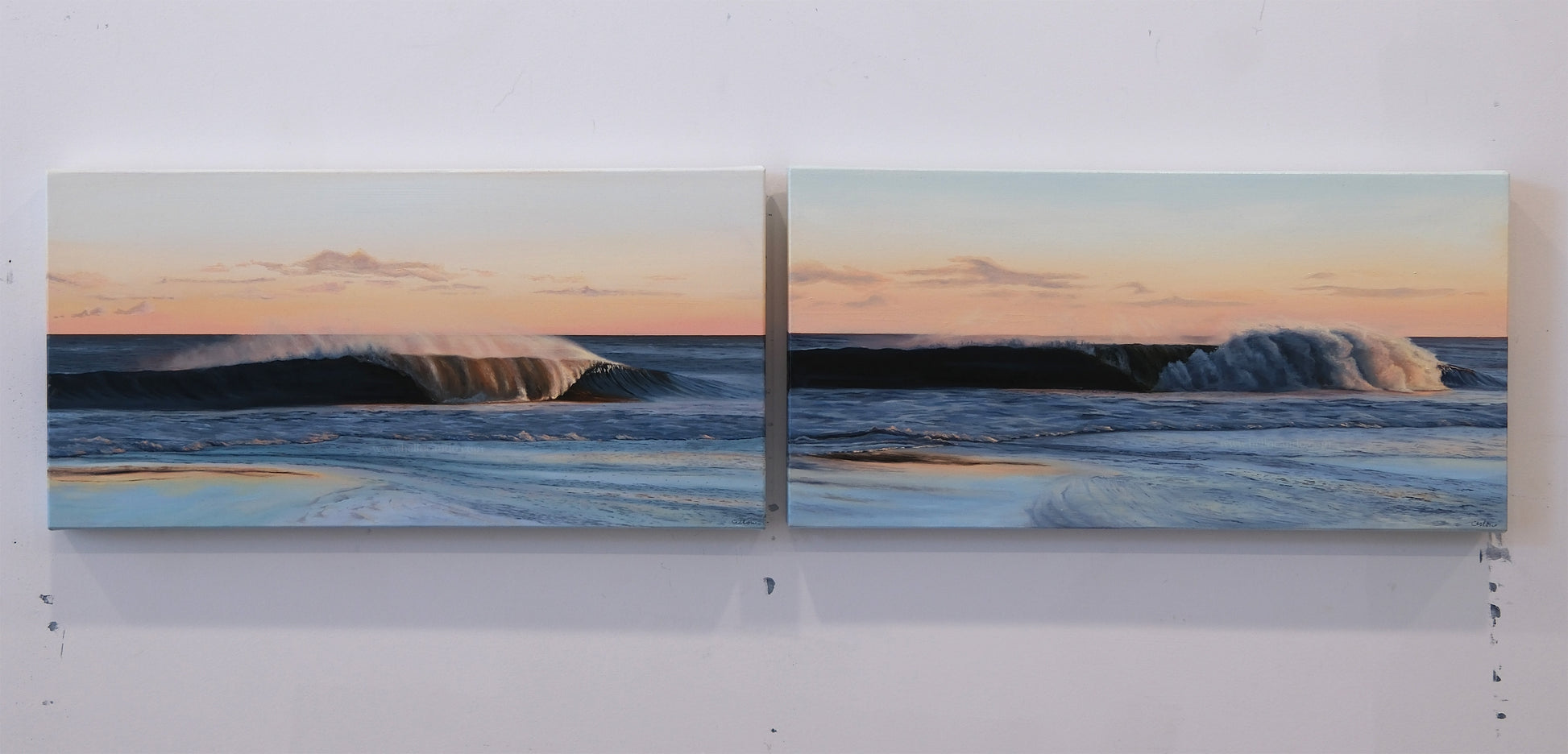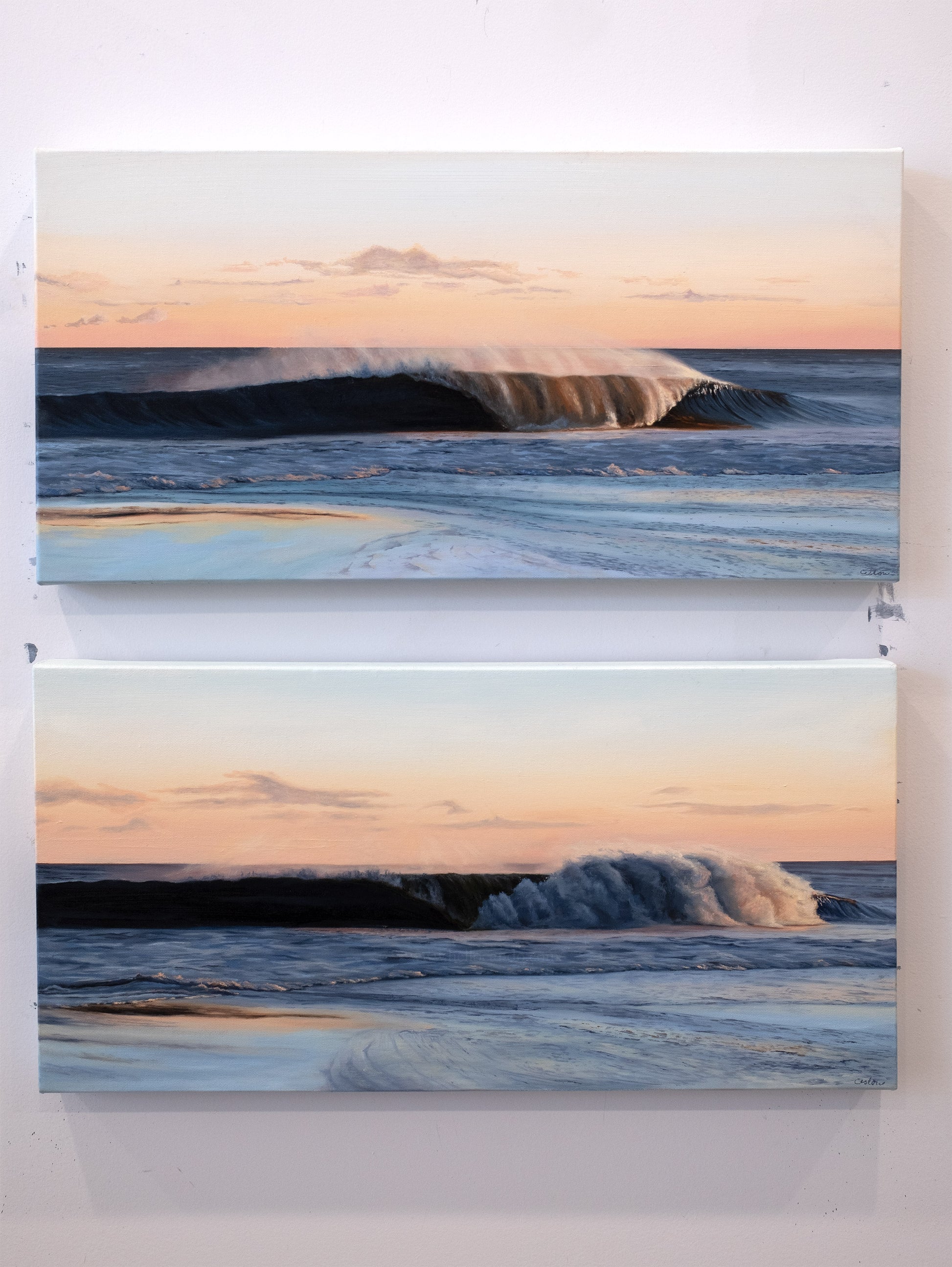 While each painting stands beautifully on its own, the two pieces can also be displayed together to extend the narrative of the wave as it breaks and settles.