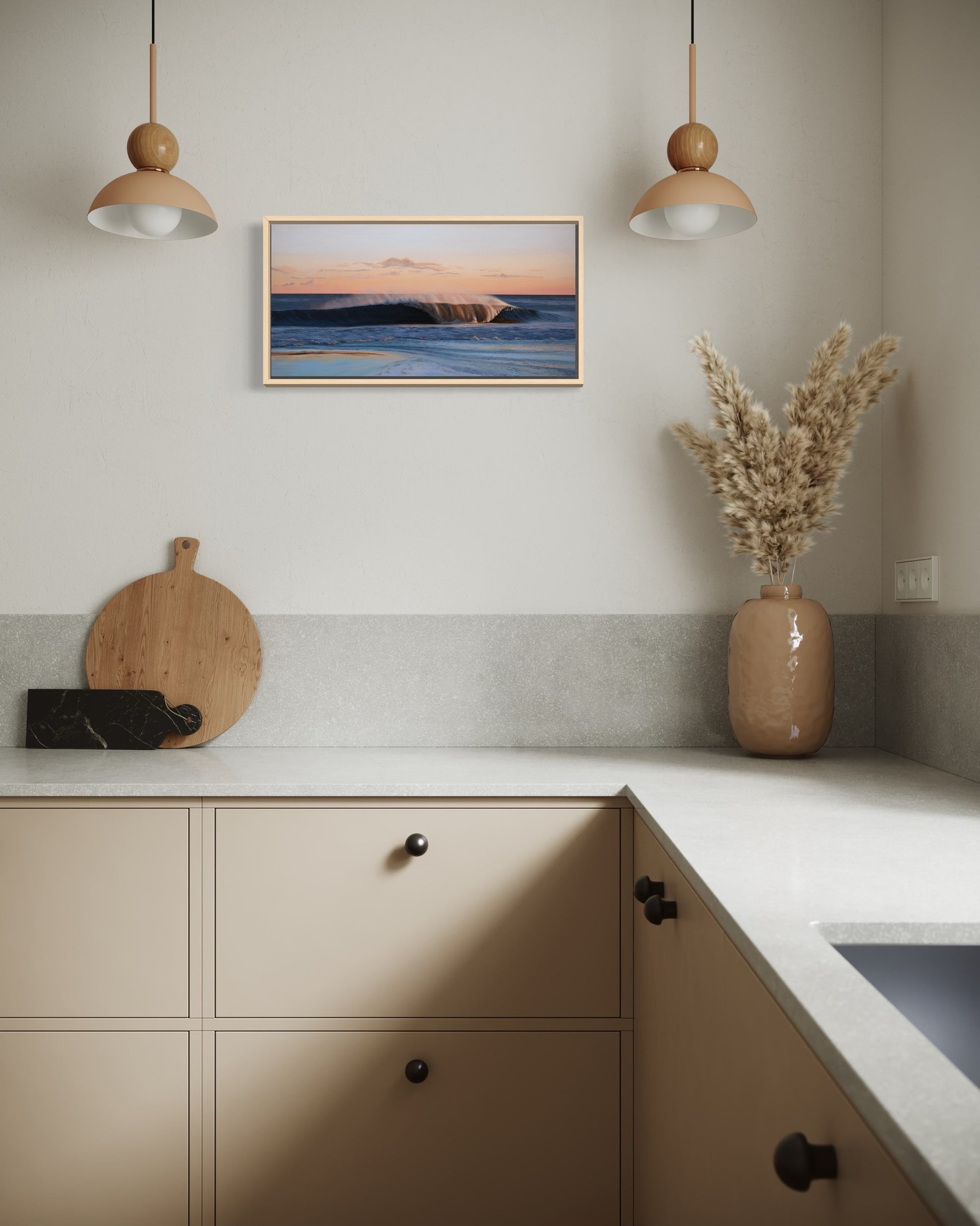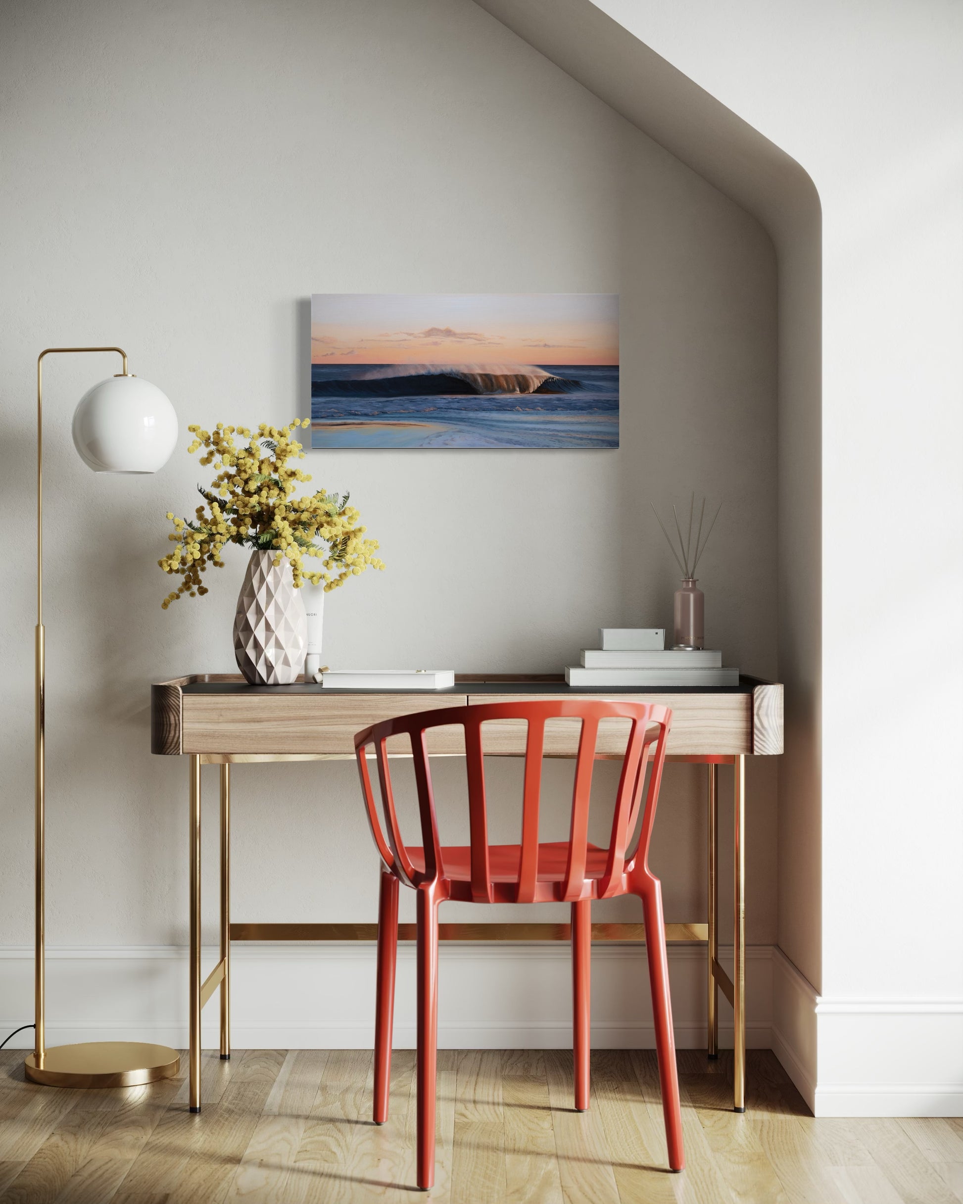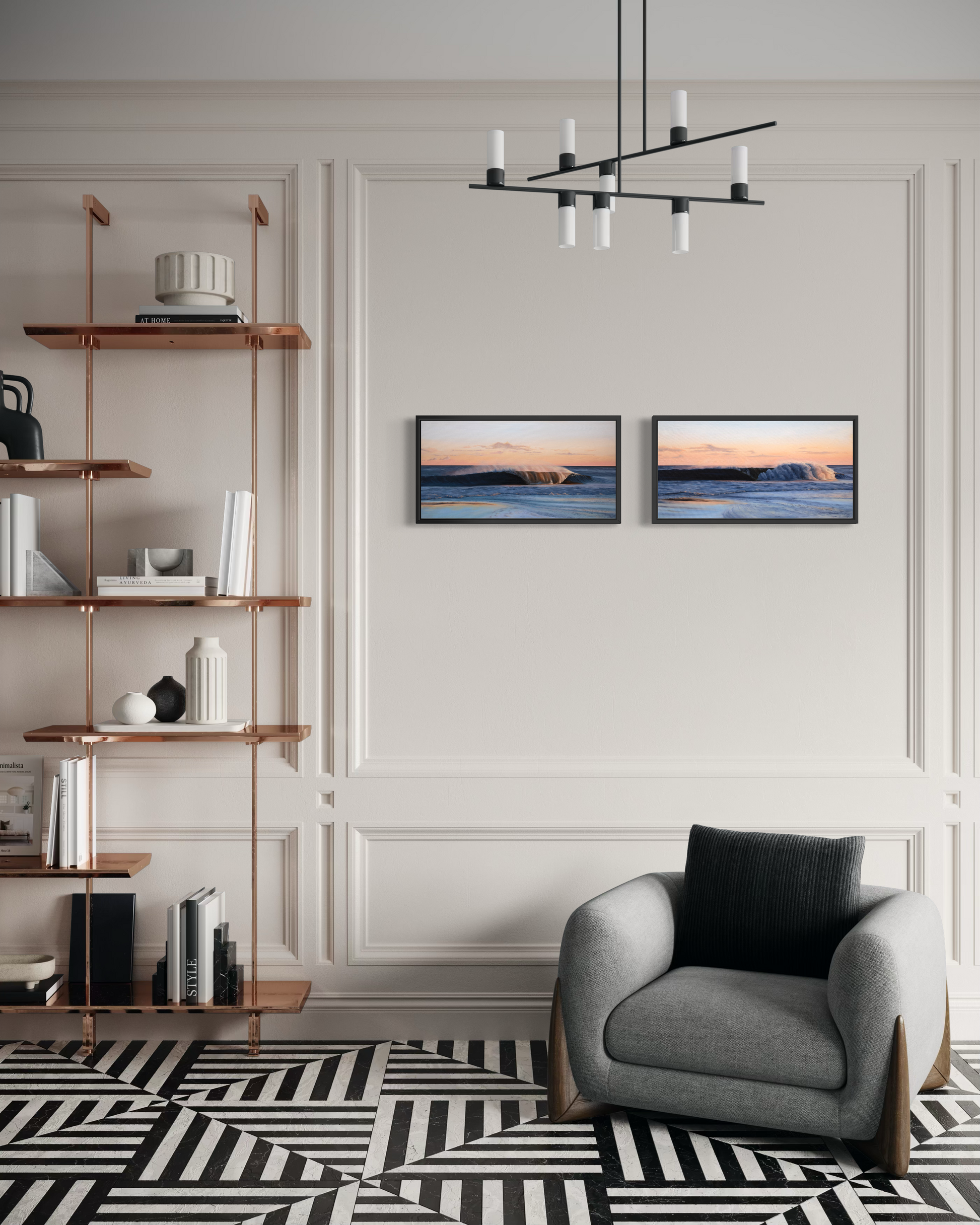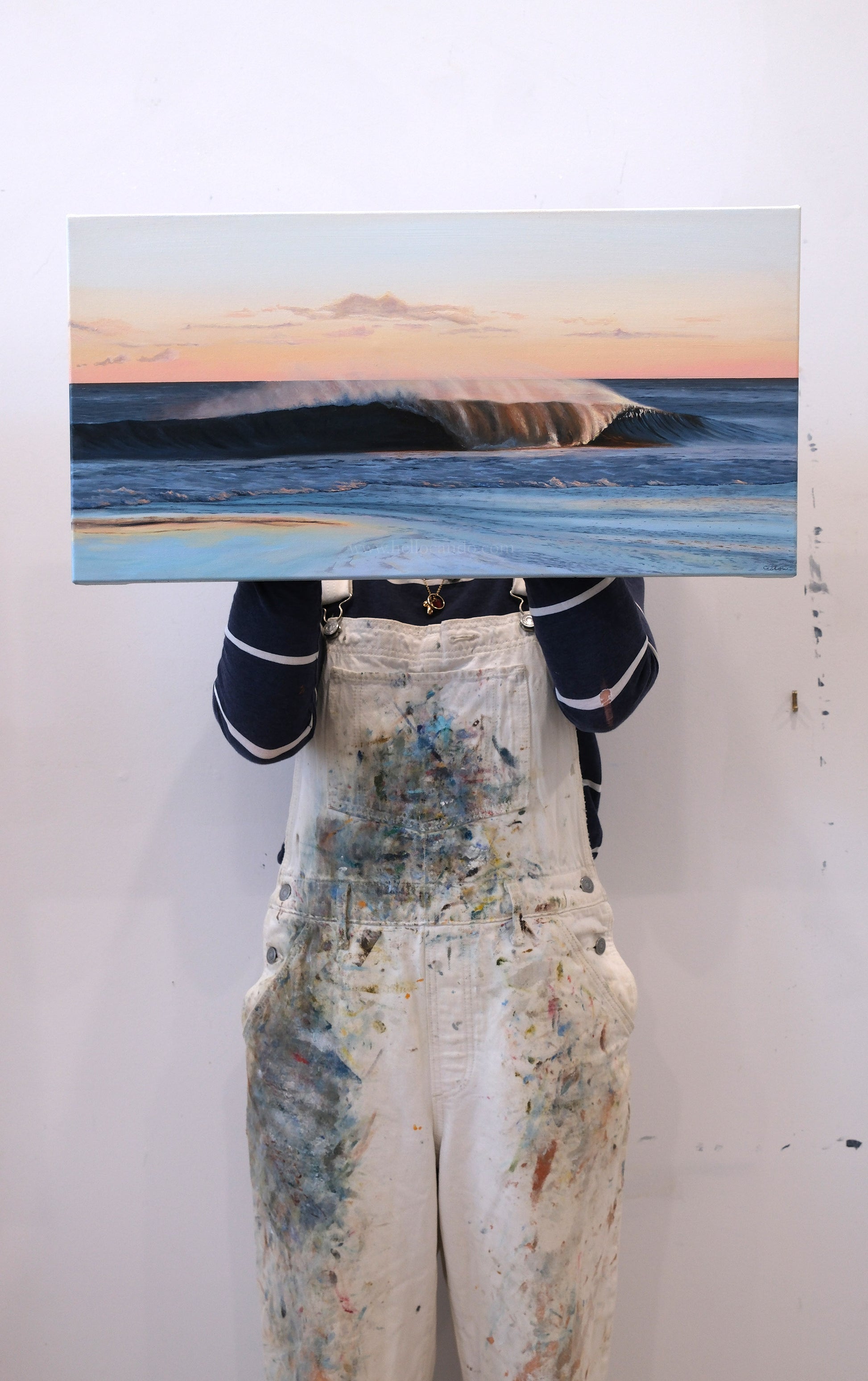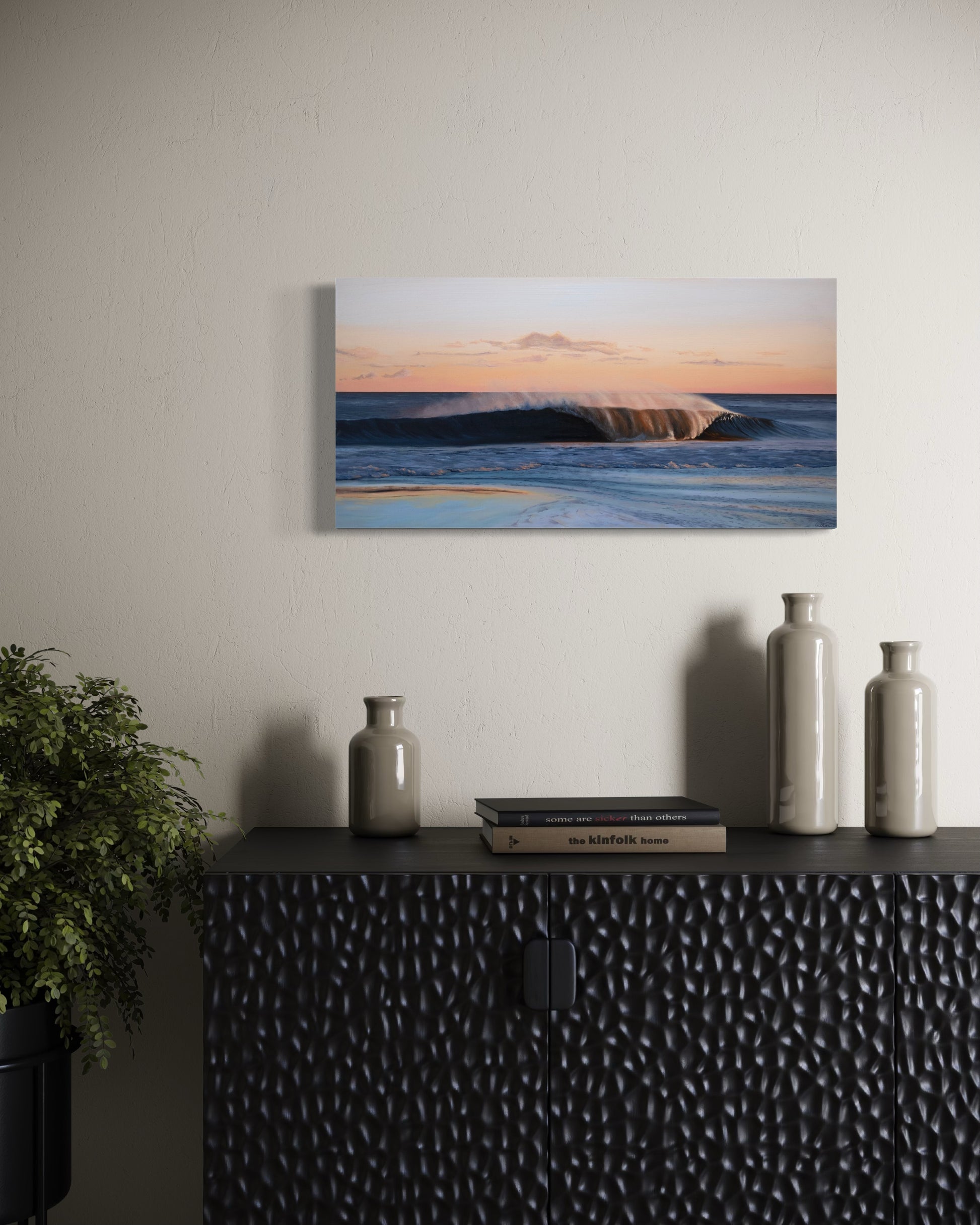 While each painting stands beautifully on its own, the two pieces can also be displayed together to extend the narrative of the wave as it breaks and settles.
