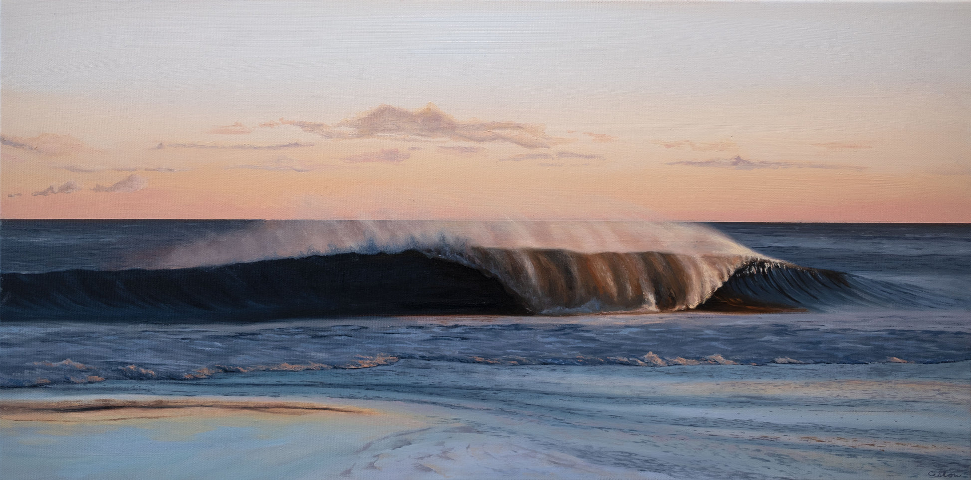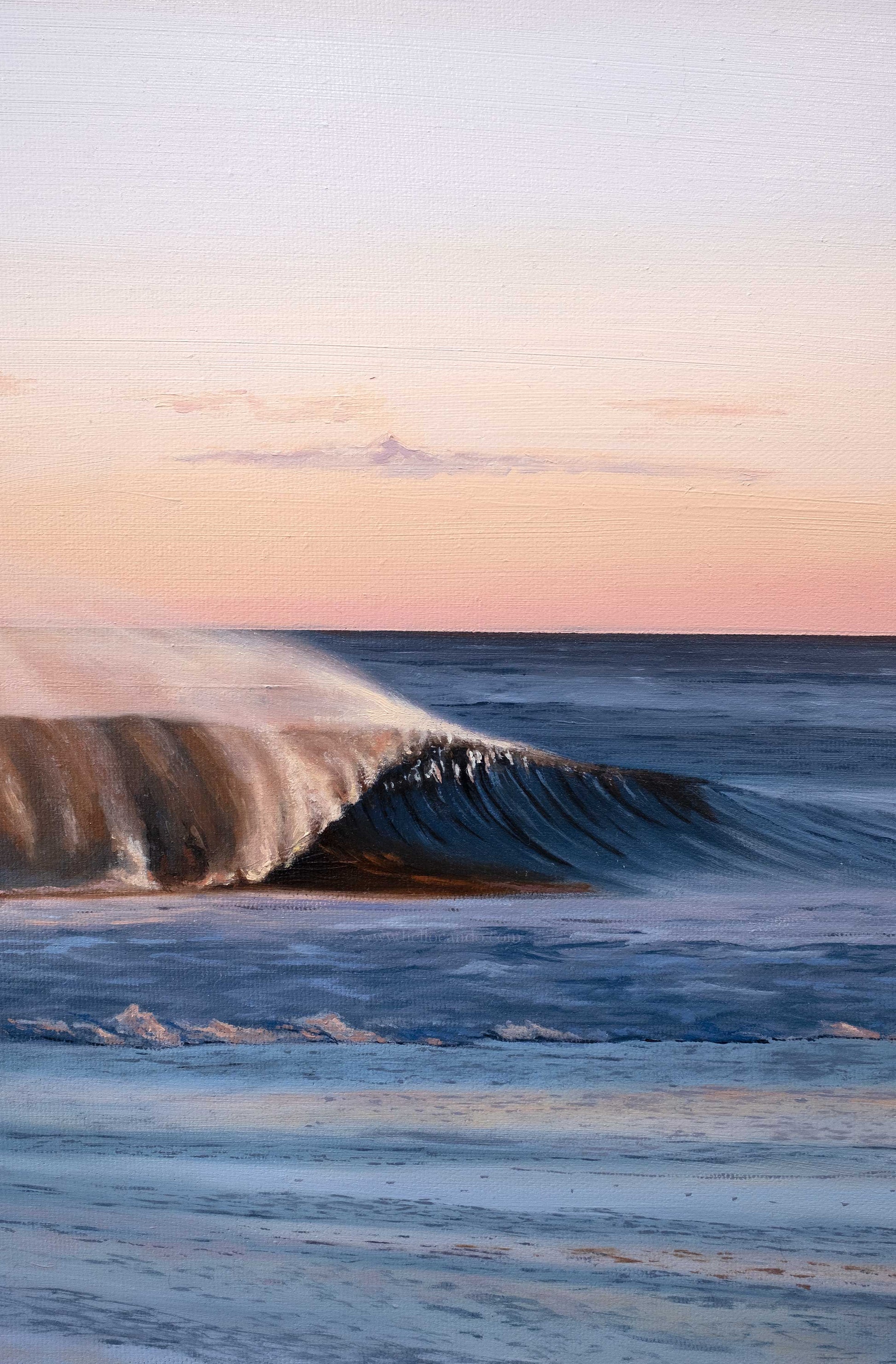 The Moment Before is an original oil painting of a rising shore break at sunset.
