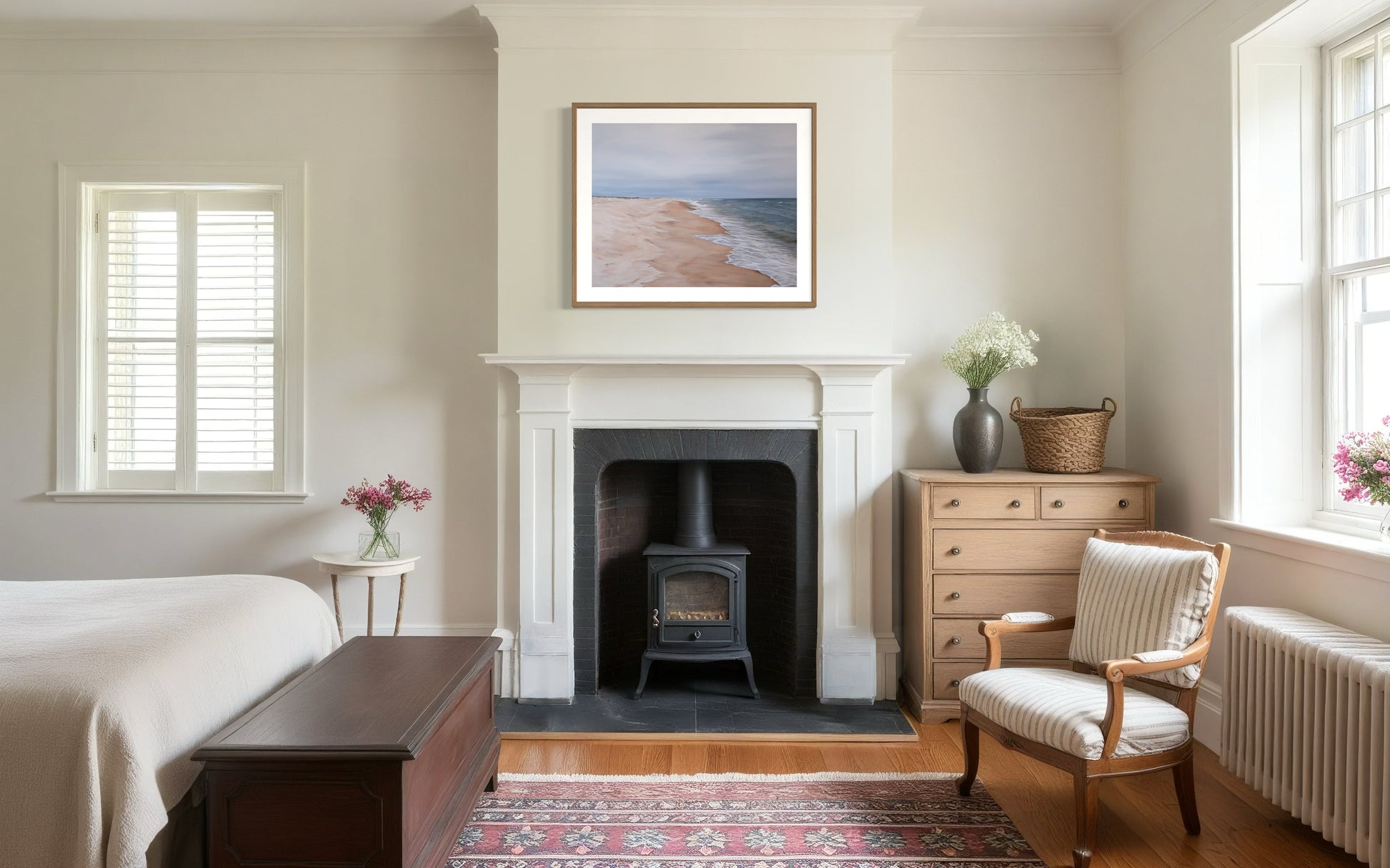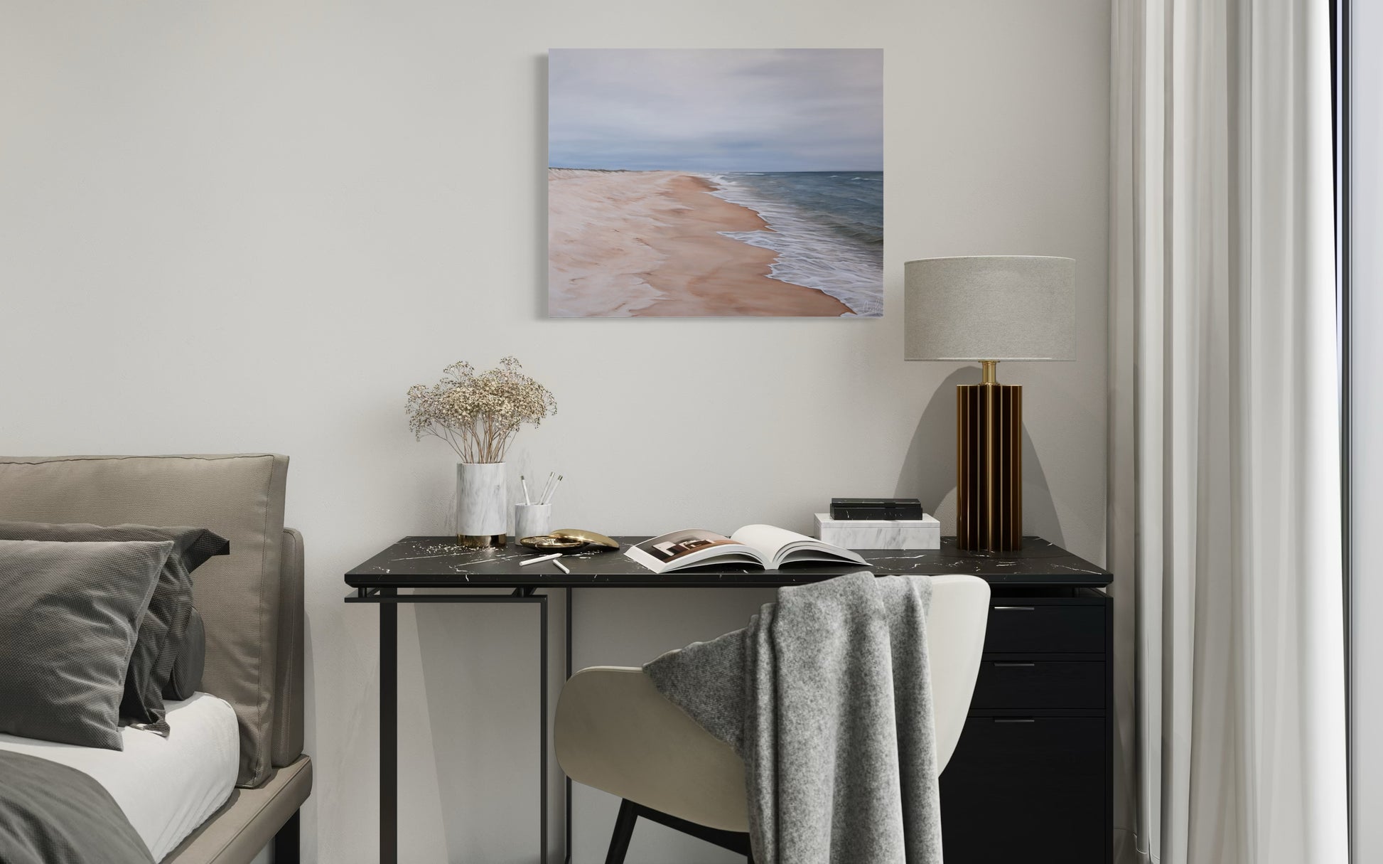 Immerse yourself in the quiet beauty of the shoreline with Wandering Tide, a fine art print of Candace Ceslow’s captivating original seascape painting. This piece brings the calm and clarity of the ocean to life, with gentle waves meeting soft sand under an expansive sky. Perfect for creating a tranquil, airy ambiance in your space, this timeless design complements any style of décor.