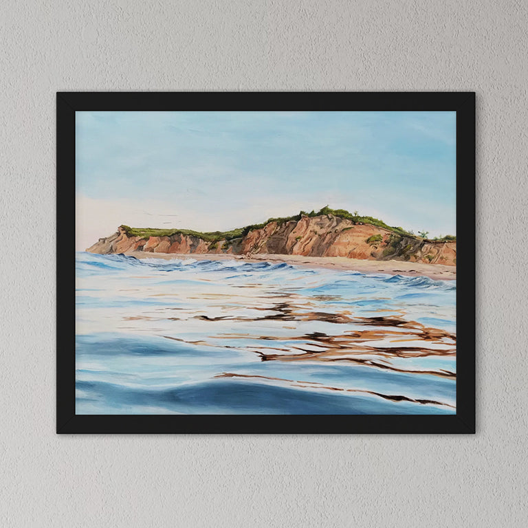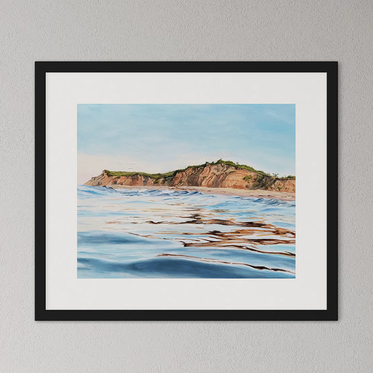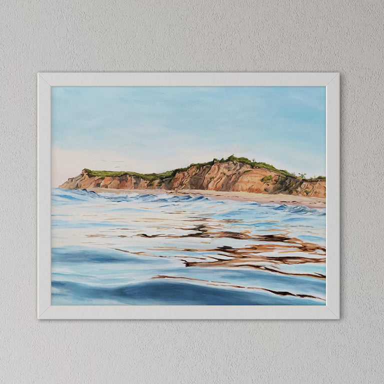 Bring the enchanting beauty of Montauk into your space with “You Could Save Me If You’d Only…,” a fine art print of Candace Ceslow’s original 24x18 inch oil painting on wood. This captivating piece showcases the stunning Montauk Hoodoos and Shadmoor, viewed from the water. The reflections of the cliffs in the ocean create a serene and contemplative atmosphere.